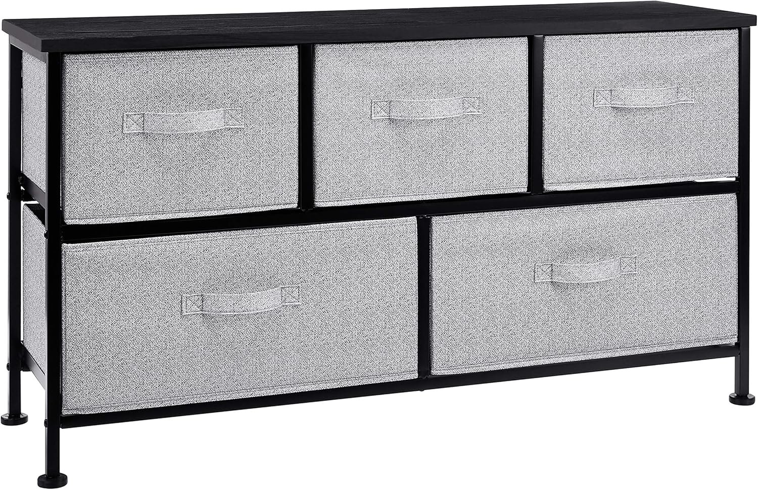 The Amazon Basics Extra Wide Fabric 5-Drawer Storage Organizer is a versatile and stylish addition to any bedroom, closet, or playroom. Featuring a sturdy steel frame, laminated wood top, and lightweight, removable fabric drawers, this organizer maximizes storage while fitting seamlessly into modern decor. Easy pull-out handles make accessing your essentials a breeze, while the wide design offers ample space for your belongings. Upgrade your organization effortlessly with this practical solution from the Amazon Basics Store.