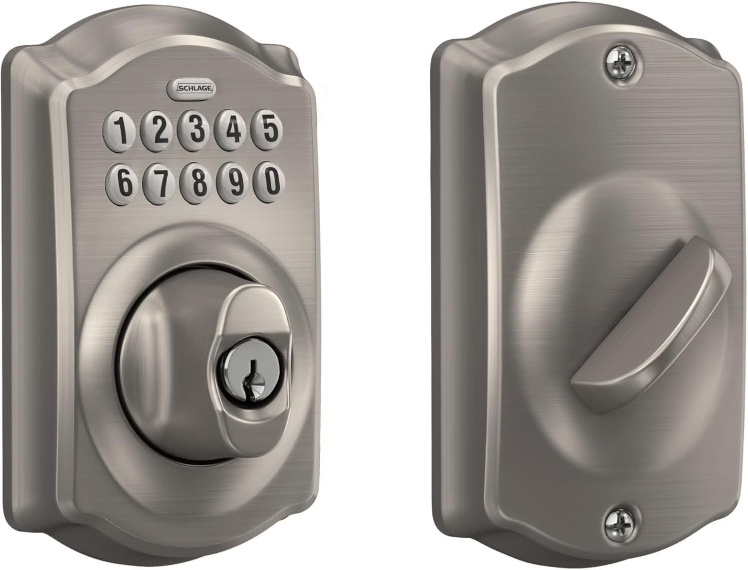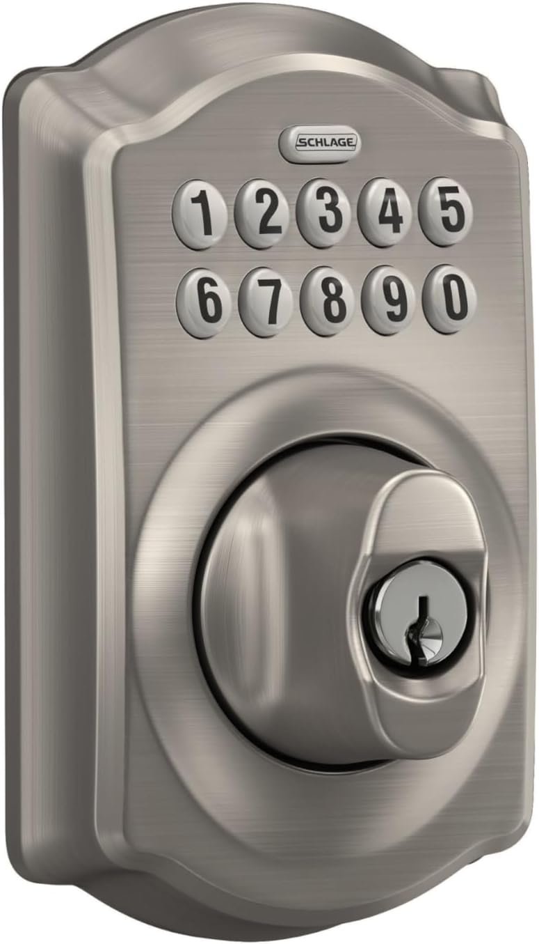 Upgrade your home security with the Schlage Camelot Electronic Keypad Deadbolt Lock, offering keyless convenience and robust Grade 2 protection. Featuring easy installation, up to 19 programmable codes, and illuminated silicone-coated numbers for hassle-free access—even in the dark—this battery-powered lock delivers reliable performance and a low-battery indicator. With Schlage’s trusted warranty and stylish satin nickel finish, it’s an ideal choice for secure, modern living.
