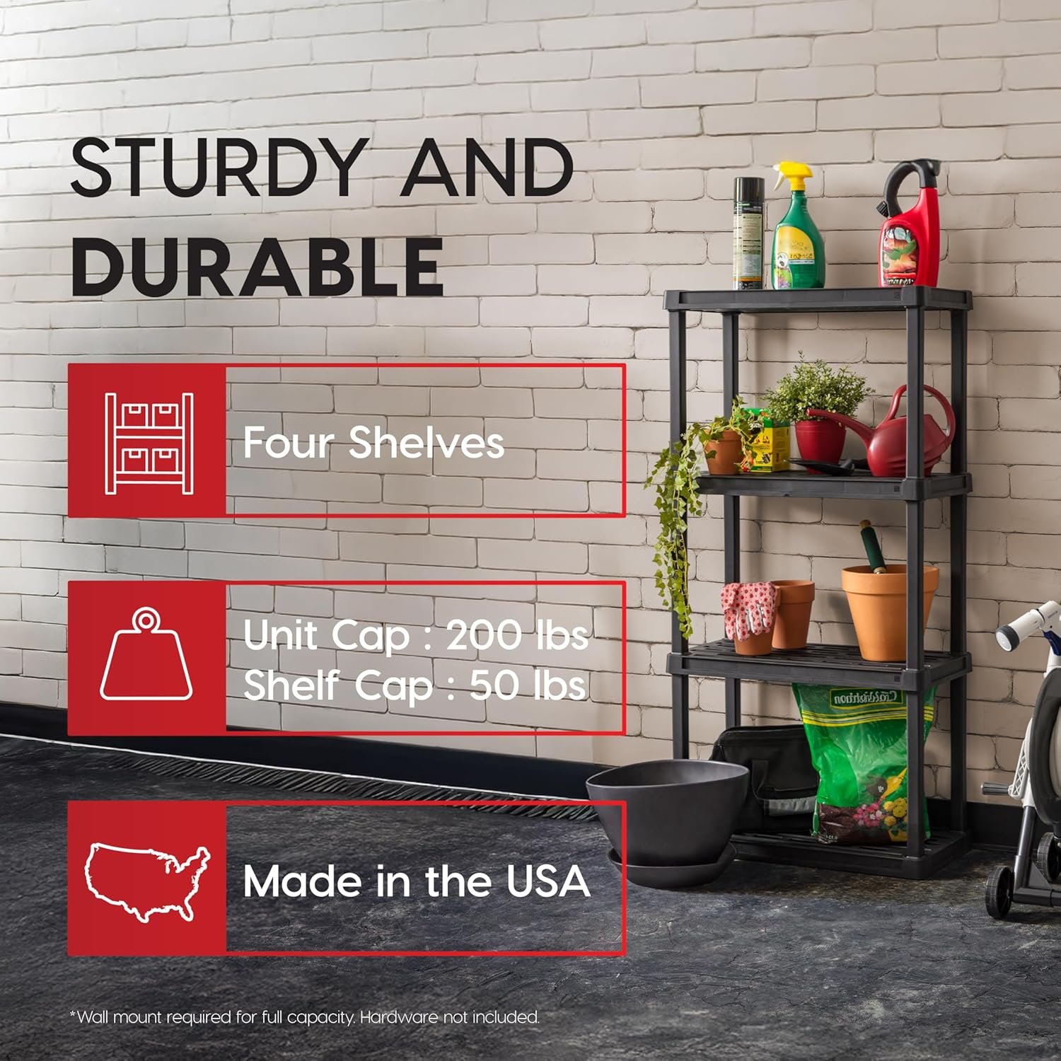 - Durable Materials: Made in the USA utilizing recycled plastic, this black storage rack offers solid moisture and rust resistance, ensuring items are kept safe even in humid conditions.
