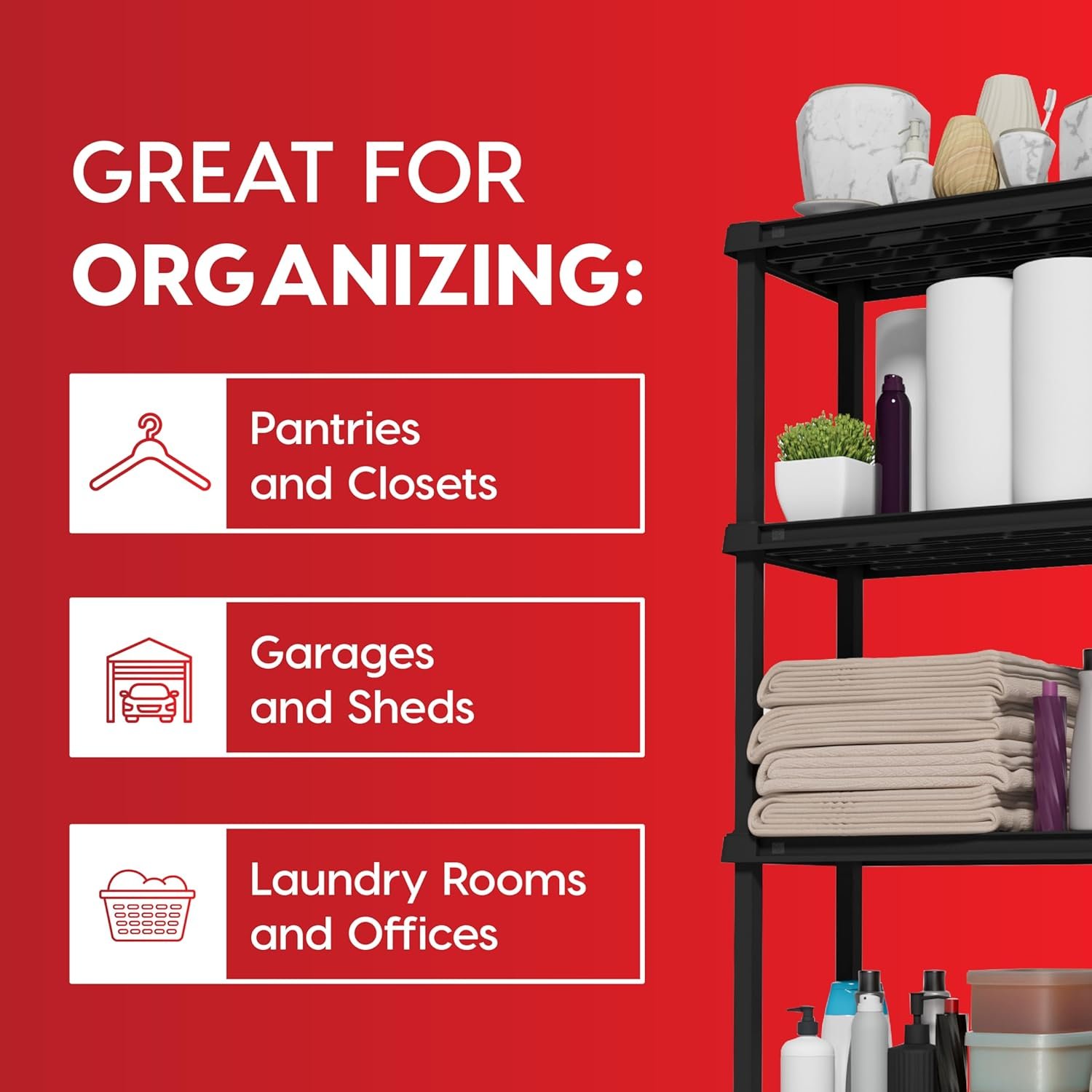 Yes, plastic shelving is moisture-resistant and works well for storing towels, cleaning products, and toiletries in bathrooms or laundry spaces. - Is assembly really tool free?